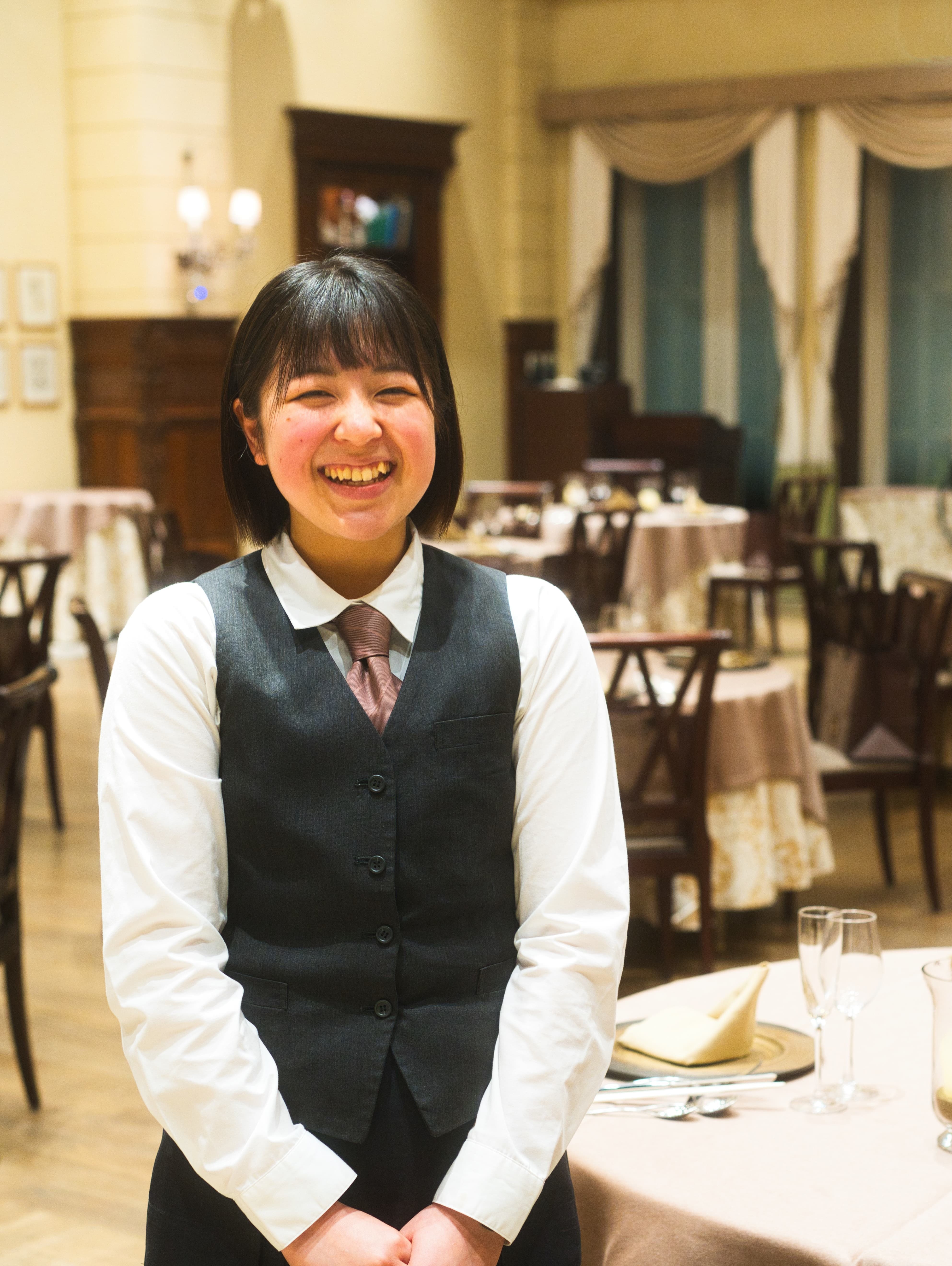 料理や礼儀作法、マナーに関する知識はもちろん必要ですが、何よりも大切にしているのは、「元気」と「笑顔」です。